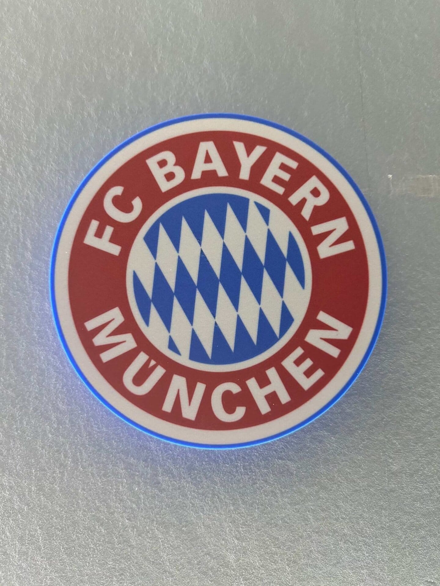 FC Bayern München LED-Leuchtschild mit 23 cm Durchmesser oder 34 cm Durchmesser. Betrieb über 3 × AA Batterien oder Akkus (nicht enthalten) oder per USB-Kabel. An/Aus-Schalter auf der Rückseite. Kann aufgehängt oder mit dem mitgelieferten Standfuß aufgestellt werden – perfekt für Schreibtisch, Regal oder Fanraum.
